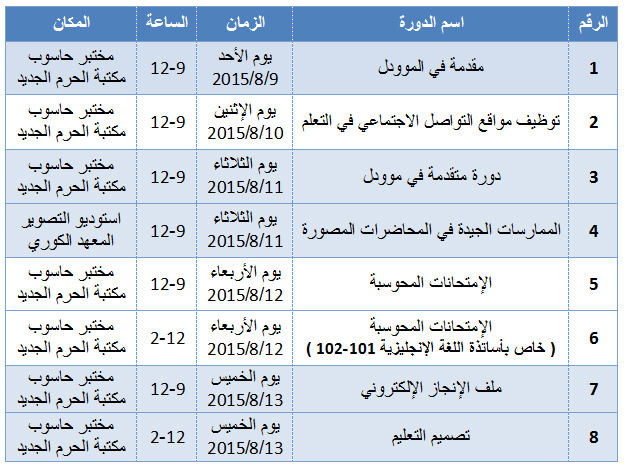 يعلن مركز التعلم الإلكتروني عن عقد مجموعة من الدورات التدريبية للفصل الأول 2015-2016 لأعضاء الهيئة التدريسية في جامعة النجاح الوطنية، وذلك في فترة السحب والإضافة في الفترة بين (9-13)-8-2015