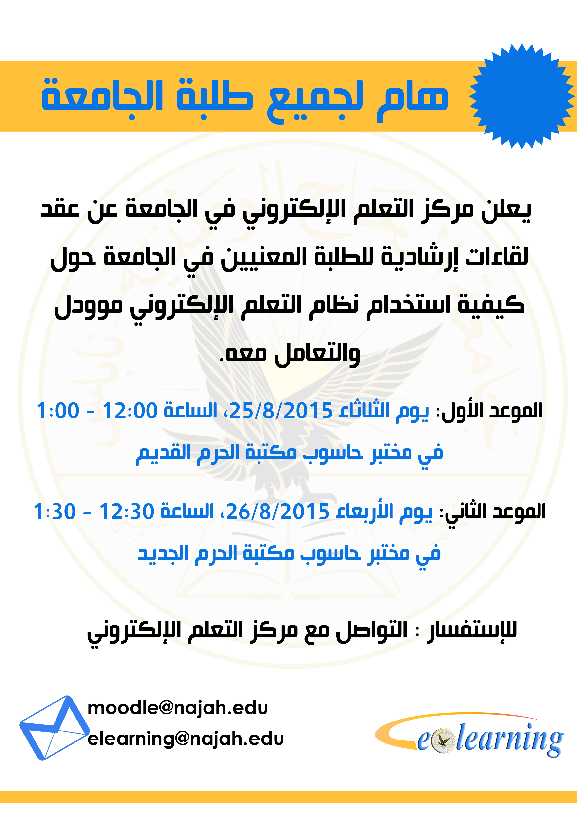 إعلان عقد لقاءات إرشادية للطلبة حول استخدام نظام التعلم الإلكتروني موودل