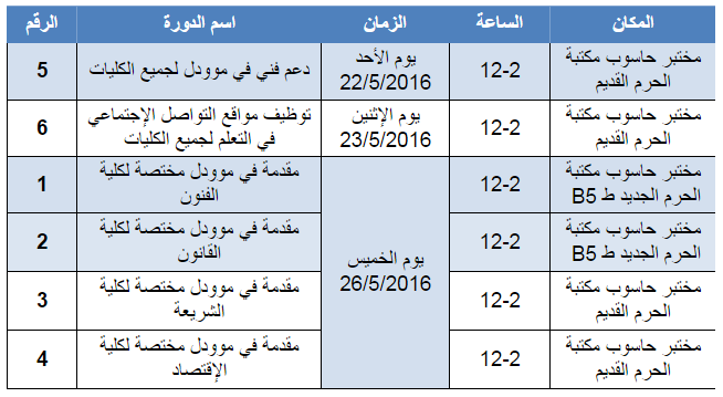 يعلن مركز التعلم الإلكتروني عن عقد الدورات التدريبية التالية للفصل الصيفي 2015-2016 لأعضاء الهيئة التدريسية في جامعة النجاح الوطنية، وذلك في فترة السحب والإضافة في الفترة بين (19-23)/2016/5.