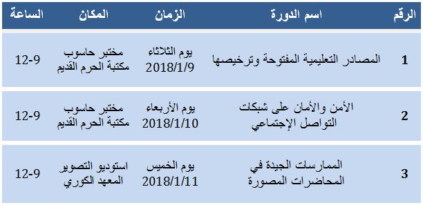 يعلن مركز التعلم الإلكتروني عن عقد مجموعة من الورش التطويرية للفصل الثاني 2017-2018 لأعضاء الهيئة التدريسية في جامعة النجاح الوطنية، وذلك في أسبوع السحب والإضافة في الفترة ما بين (8-14) / 1 / 2018.